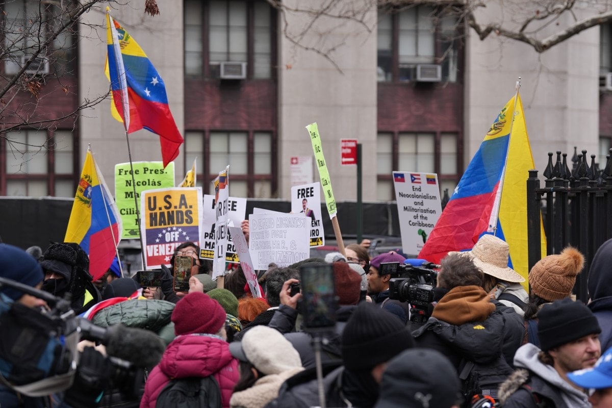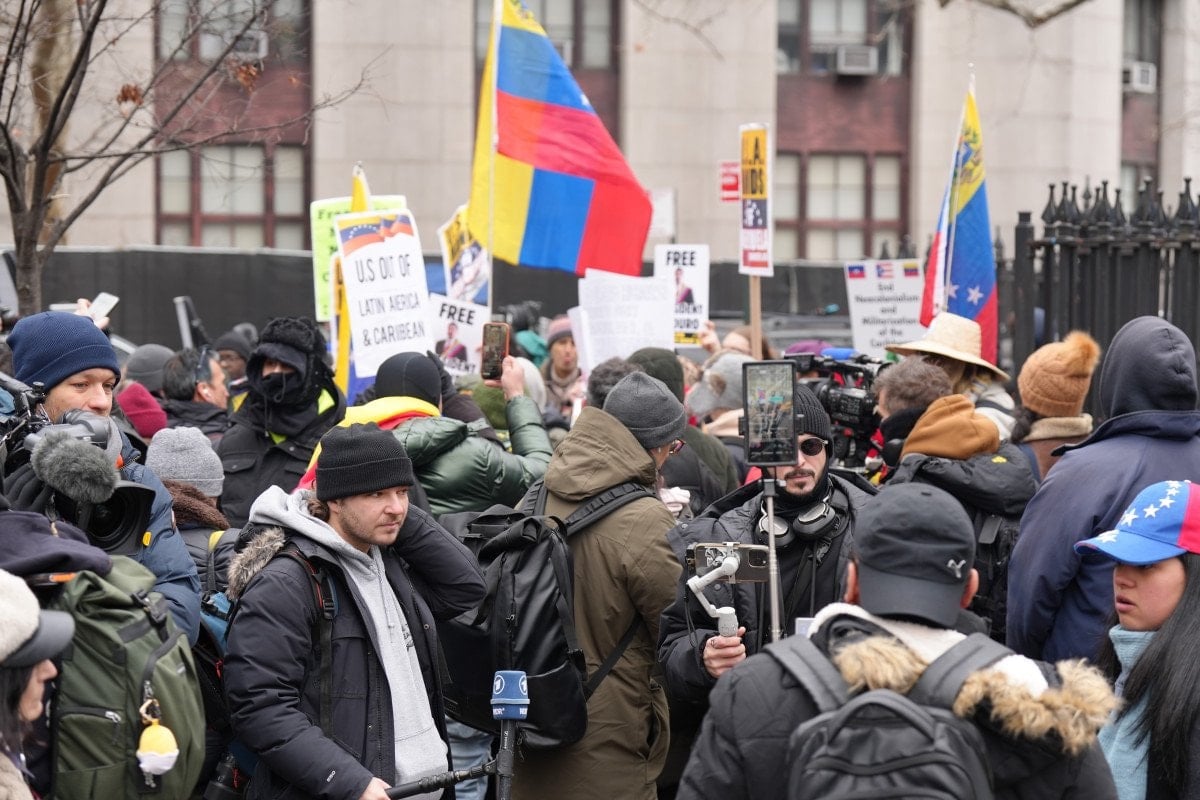 New York’un Manhattan bölgesinde bulunan Güney Bölge Federal Mahkemesi önünde Venezuelalılar dahil bir grup protestocu, Maduro ve eşinin serbest bırakılmasını talep ederek bir protesto düzenledi. “ABD, Latin Amerika ve Karayiplerden çekil”, “Özgür Maduro” ve “Trump gitmeli” sloganlarını taşıyan protestocuların sesi yargılamanın hemen öncesinde yükseldi.