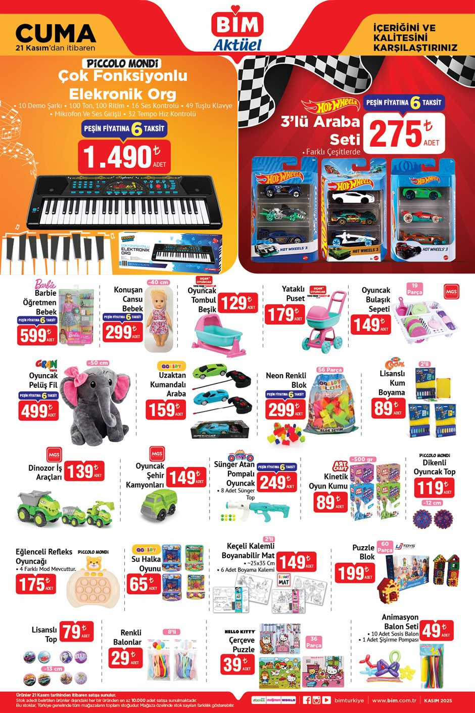 Bim aktüel ürünler 21 Kasım 2025 kataloğu yayımlandı. Bu hafta bim aktüel 21 Kasım 2025 kataloğu içerisinde; Çok Fonksiyonlu Elektronik Org 1.490 TL 3’lü Araba Seti 275 TL, Oyuncak Bulaşık Sepeti 149 TL, Yataklı Puset 179 TL, Oyuncak Tombul Beşik 129 TL, Konuşan Cansu Bebek 299 TL, Barbie Öğretmen Bebek 599 TL ‘den raflarda ve bim online alışveriş sitesi bim.com.tr’de hazır bekliyor. Peki, bim’de bu hafta cuma neler var? İşte, Bim aktüel 21 Kasım 2025 kataloğu tamamı…